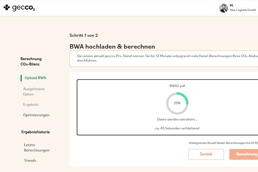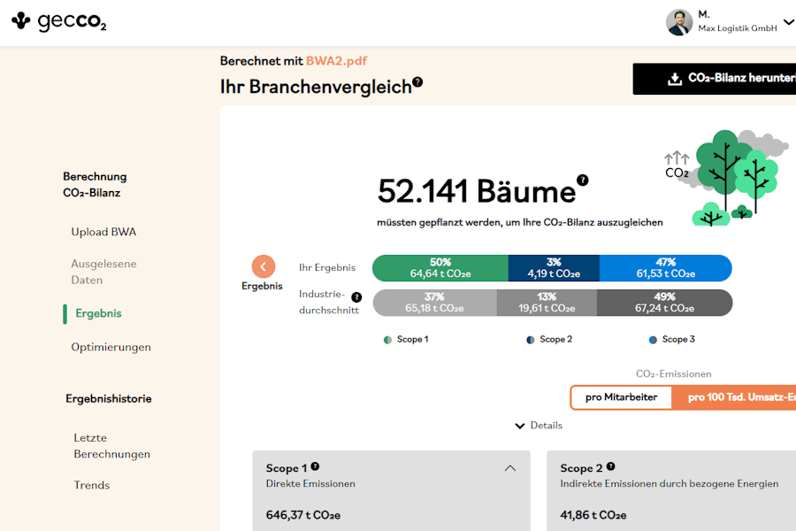 “Das Besondere an gecco2 ist, dass schon das Hochladen Ihrer BWA genügt, um in kürzester Zeit eine CO2-Analyse zu erstellen.”